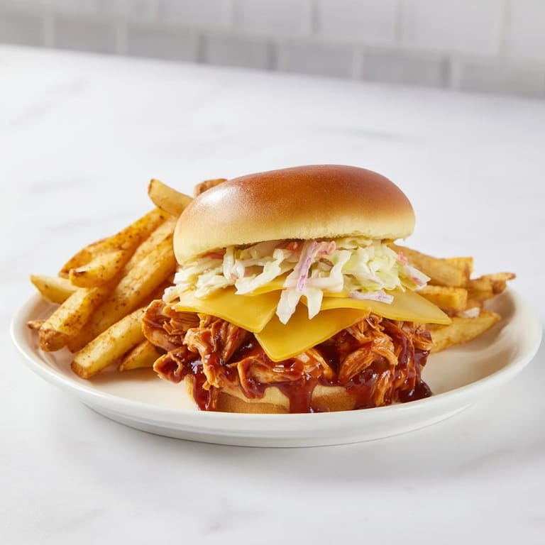 Pin It Juicy shredded BBQ chicken served on soft slider buns, paired with crispy golden fries. This combo is perfect for casual gatherings or family dinners, bringing together smoky flavors and crunchy textures in every bite.
