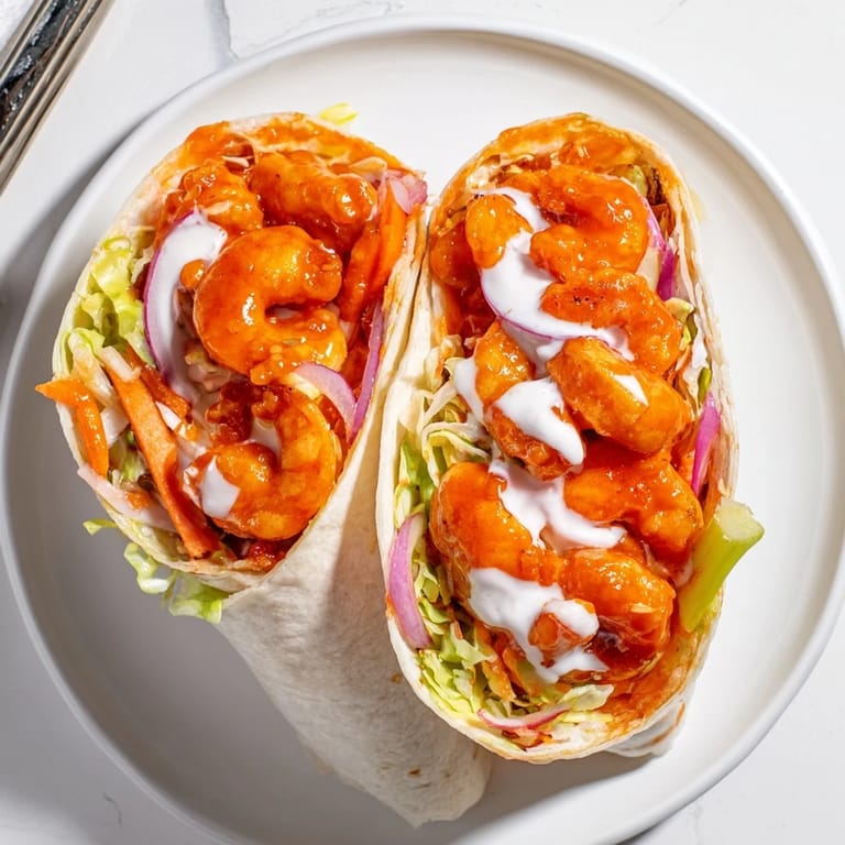 Pin It Plump shrimp tossed in spicy buffalo sauce, wrapped with crisp lettuce, creamy ranch, and tangy vegetables for a zesty, satisfying meal.