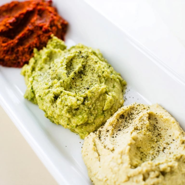 Pin It A colorful platter featuring three distinct dips—creamy avocado, roasted red pepper, and golden turmeric hummus—arranged side by side for a stunning and delicious appetizer