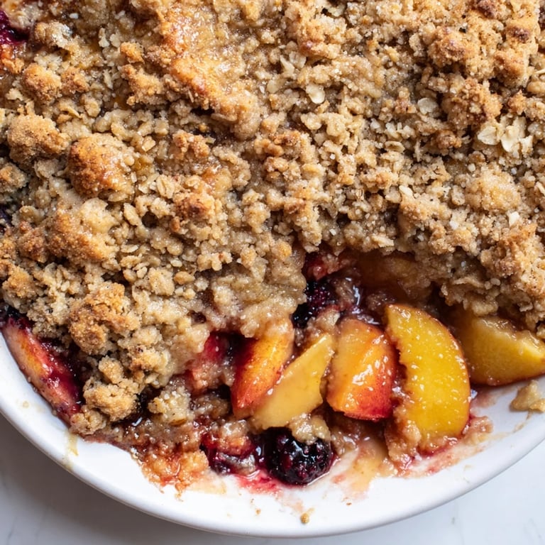 Pin It A comforting, budget-friendly dessert featuring sweet frozen fruit and a golden oat topping—perfect for using pantry and freezer staples.