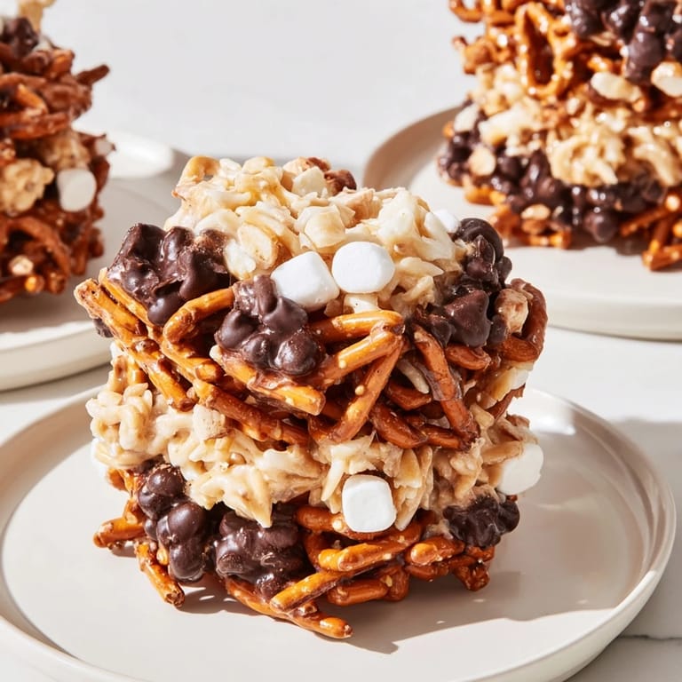 - In another bowl, melt semisweet chocolate chips in the microwave, stirring until smooth. Add pretzel sticks and mini marshmallows; mix gently. Spoon smaller mounds on top of each butterscotch base to create the middle layer. Allow to set for 5 minutes.