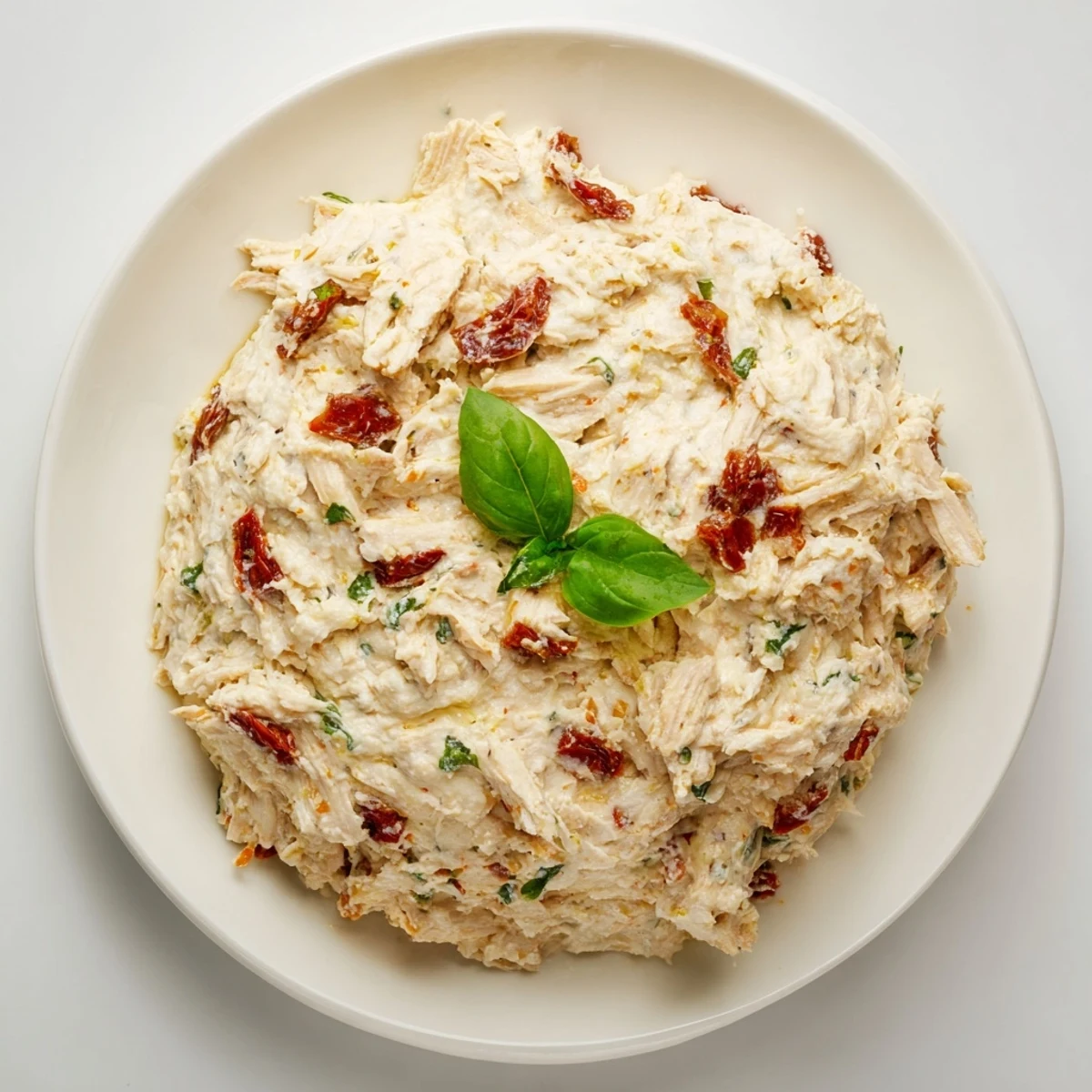 - In a large bowl, combine shredded chicken, sautéed garlic and sun-dried tomatoes, light cream cheese, Greek yogurt, mozzarella, Parmesan, basil, oregano, thyme, red pepper flakes, salt, and black pepper. Mix until well blended.