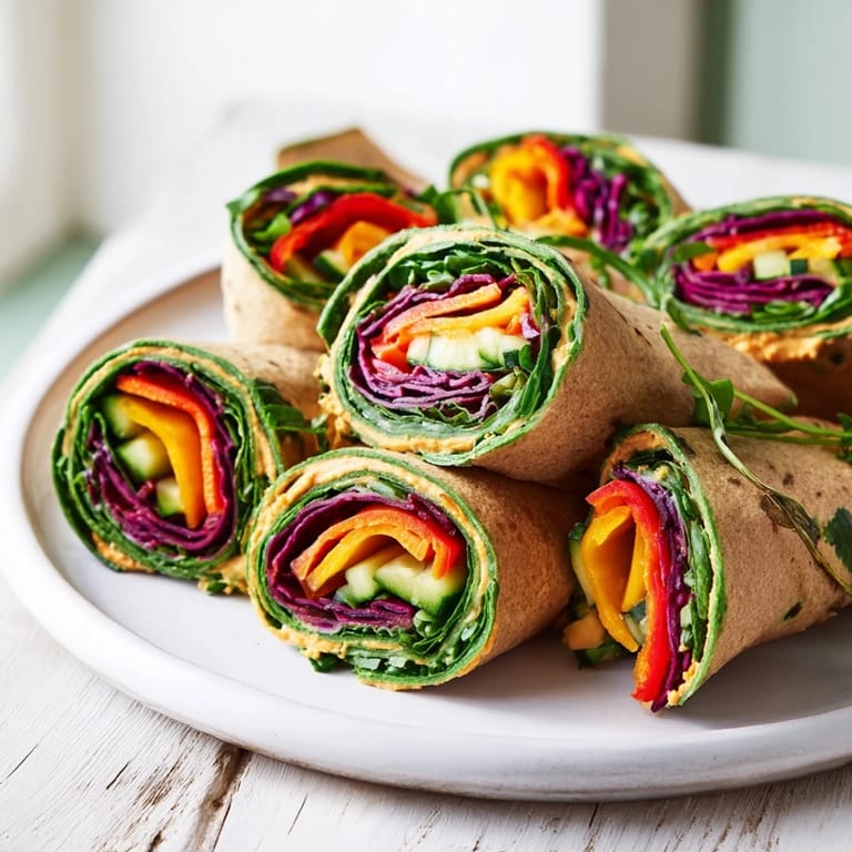 For extra flavor, use roasted garlic or red pepper hummus instead of plain. Add roasted beet or carrot strips to introduce more colors and layers of taste. Swap spinach tortillas for whole wheat or flavored varieties if desired.