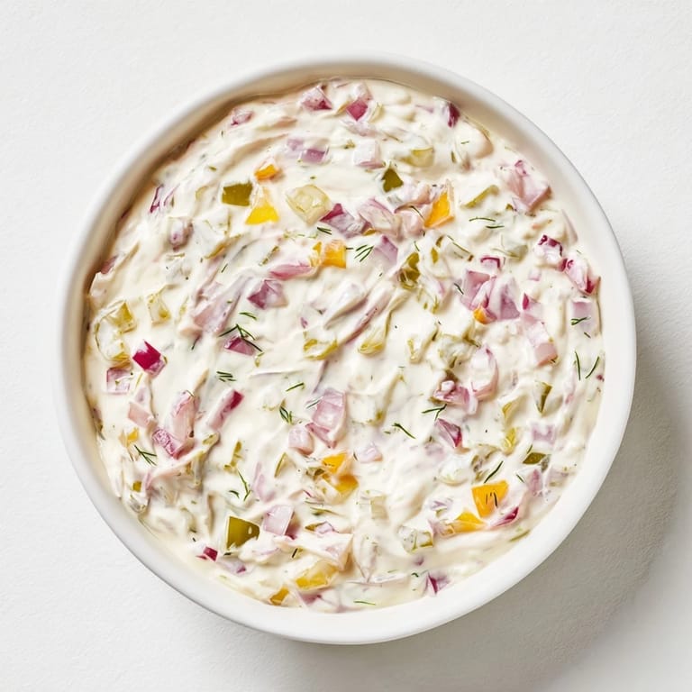 Pin It A tangy, creamy dip featuring sweet and sour pickle relish that is perfect for chips, sandwiches, or as a burger topping.