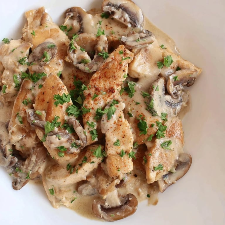 Pin It A comforting and flavorful dish featuring tender chicken in a rich, creamy mushroom sauce, perfect over noodles or rice.