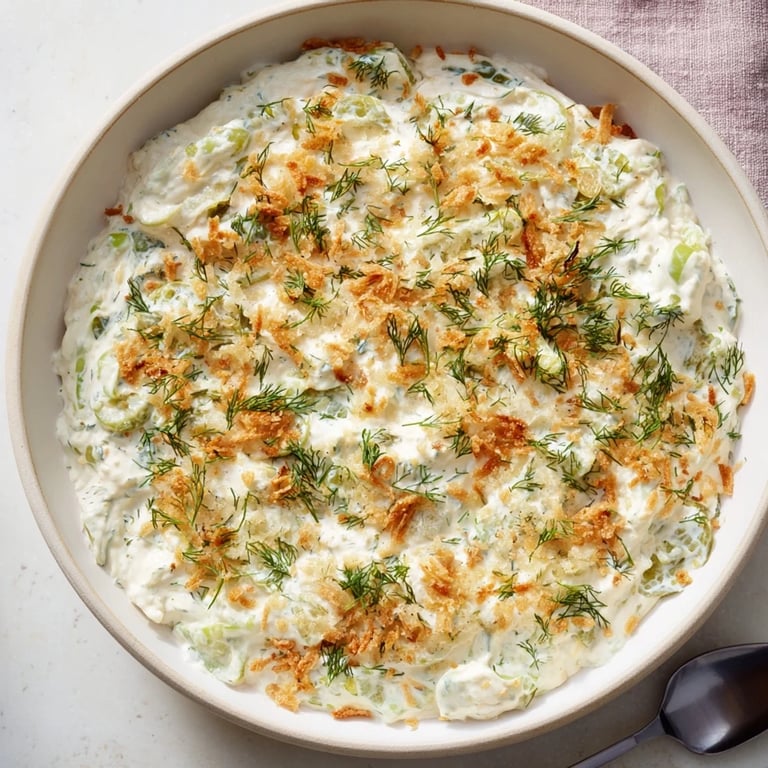 This tangy and creamy dip blends softened cream cheese and sour cream with finely chopped dill pickles and pickle juice. Garlic powder and optional dried dill add depth to the flavor, while toasted panko breadcrumbs and fresh dill create a crispy, herbaceous topping. Ready in just 10 minutes, it pairs perfectly with chips, crackers, or fresh vegetables for an easy, flavorful snack that suits vegetarian and gluten-free preferences when adjusted.