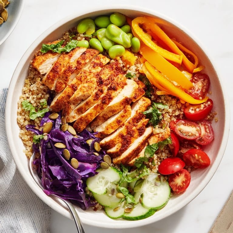 Pin It A vibrant, nutrient-packed meal featuring colorful vegetables, wholesome grains, lean protein, and a zesty dressing, designed for easy meal-prep and beautiful presentation.