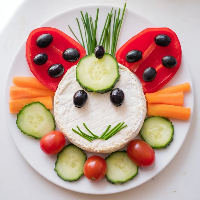 This ladybug-themed platter pairs wonderfully with a light rosé wine or sparkling lemonade, making it ideal for a family picnic or casual get-together. Serve chilled to keep dips fresh and vegetables crisp.