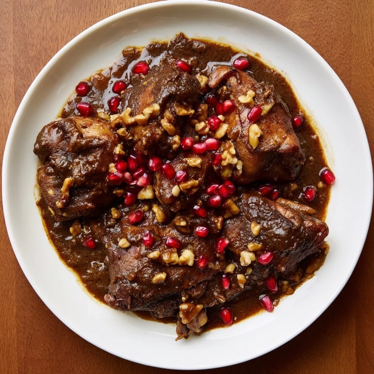 Pin It A rich, tangy-sweet Persian stew featuring tender chicken thighs simmered in a luscious sauce of ground walnuts and pomegranate molasses. This affordable version maintains authentic flavor while being budget-friendly.