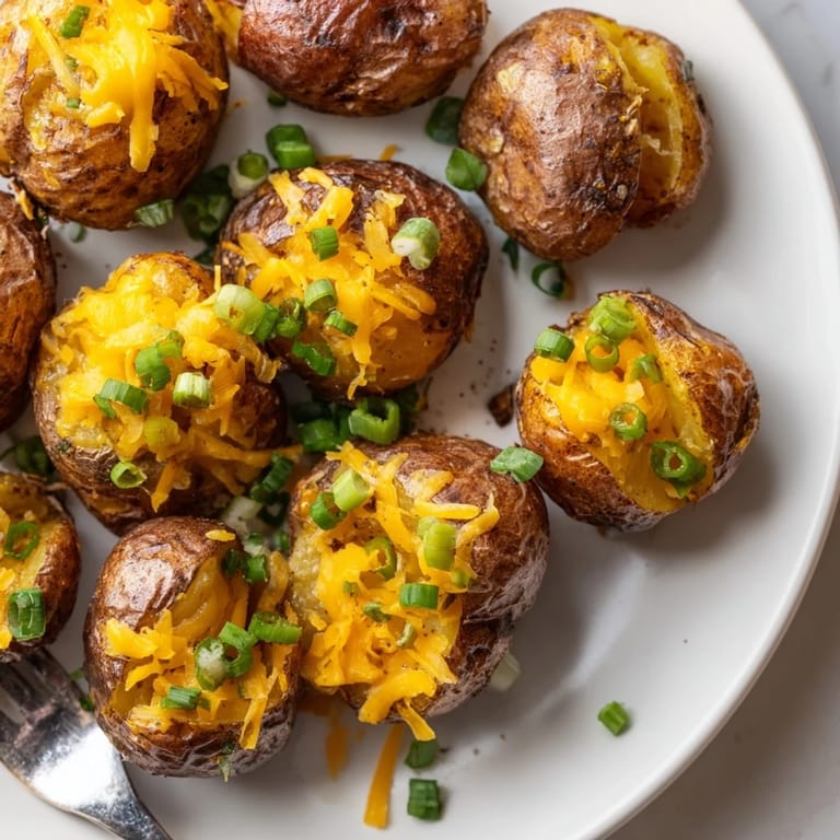 Crispy smashed baby potatoes topped with cheddar cheese and fresh green onions make for a mouthwatering addition to any table. Simply boil, smash, season with garlic powder, smoked paprika, and olive oil, then roast until golden. Finish with a sprinkle of cheese and green onions, melting everything together for the perfect savory treat. Enjoy hot as an appetizer or side, garnished with parsley and served with your favorite dip. This gluten-free, vegetarian option is simple, flavorful, and sure to impress.