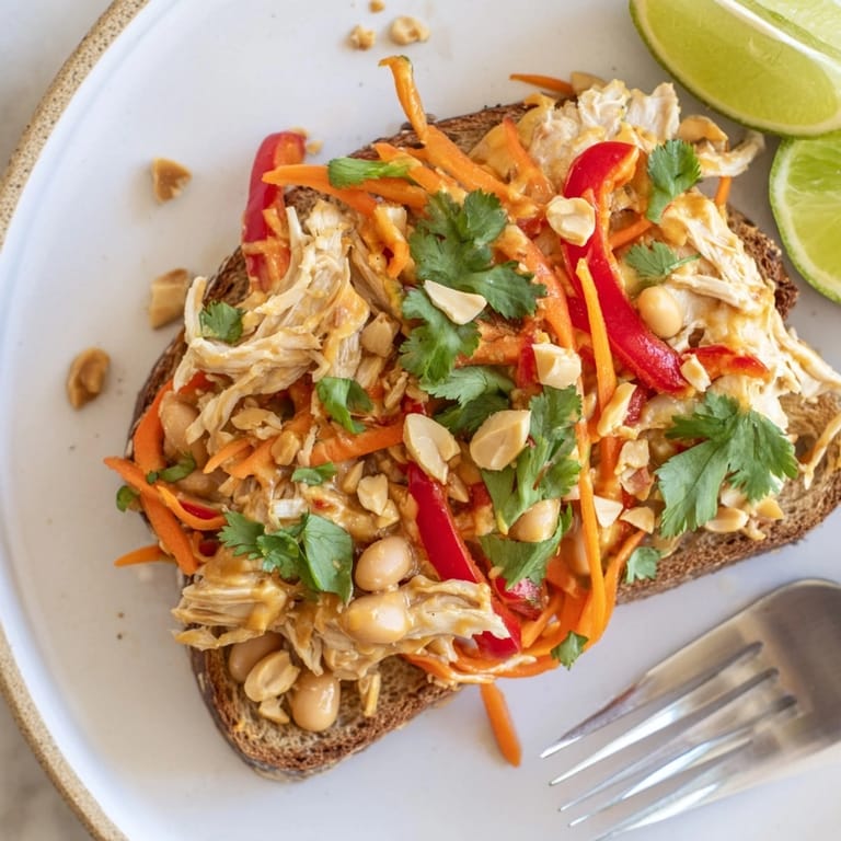 Pin It This vibrant Thai Peanut Pinto Chicken Toast brings together bold flavors in one hearty open-faced sandwich. A creamy, spicy peanut sauce blankets juicy chicken and pinto beans, brightened by crisp vegetables and fresh herbs on crunchy toasted bread. I love serving this as a fun lunch that feels fancy but comes together in thirty minutes flat.